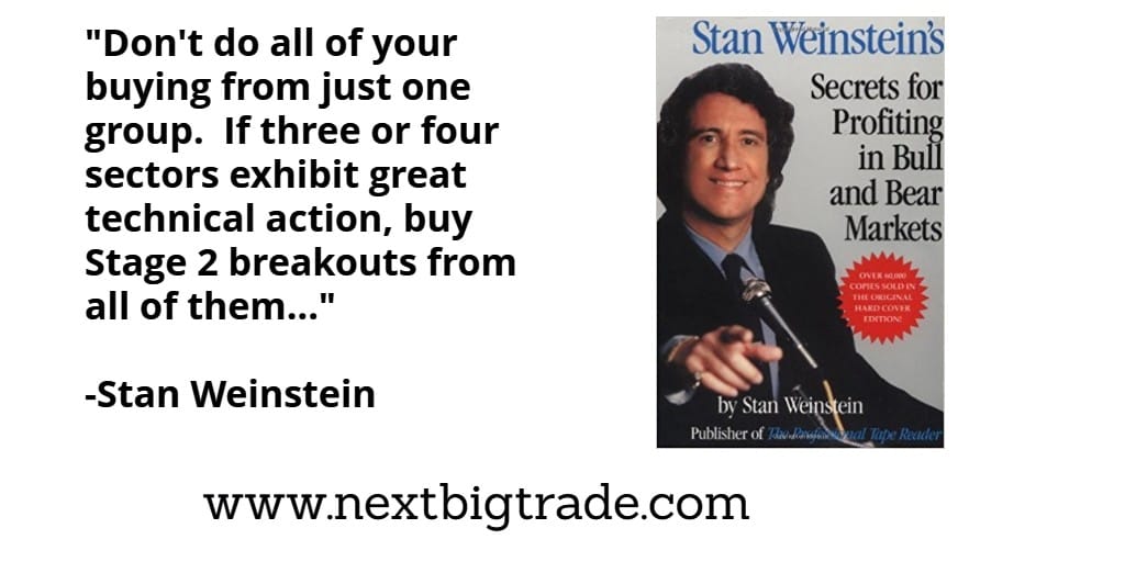 Stan Weinstein discusses trading multiple sectors when more than one sector is breaking out into Stage 2. What this does is creates a process of discovery where trades are taken in different sectors that break out and start outperforming the S&P 500. Then more observations can be made to determine which sectors are continuing to outperform and which sectors are starting to lag. At that point capital can be reallocated and concentrated into stronger sectors as a major move matures and diverted away from sectors that are starting to underperform. So in essence its a process of planting seeds initially in multiple sectors that are breaking out, and then later allowing the stronger trades to flourish while cutting back on the weaker trades that start to stall out.